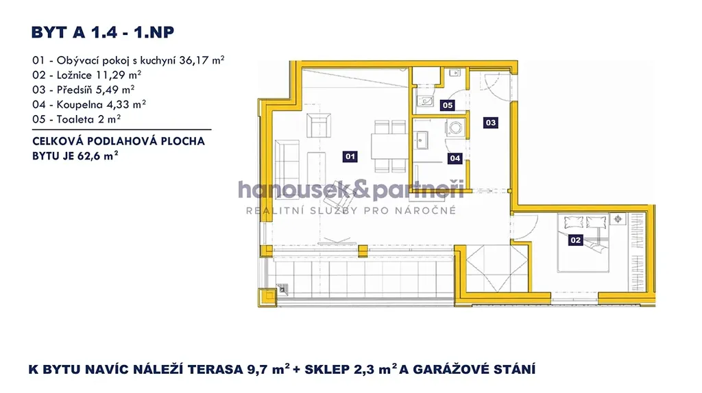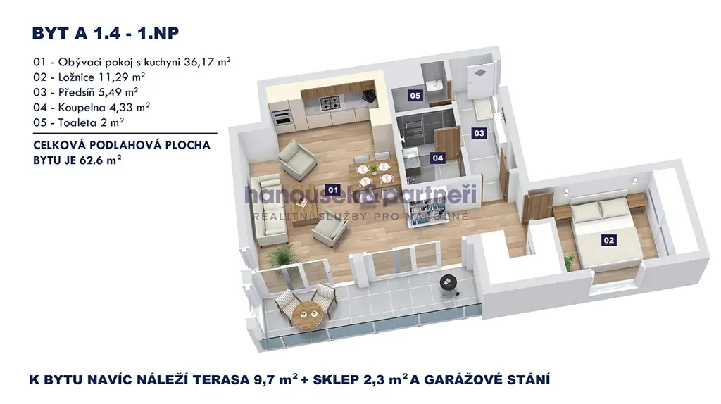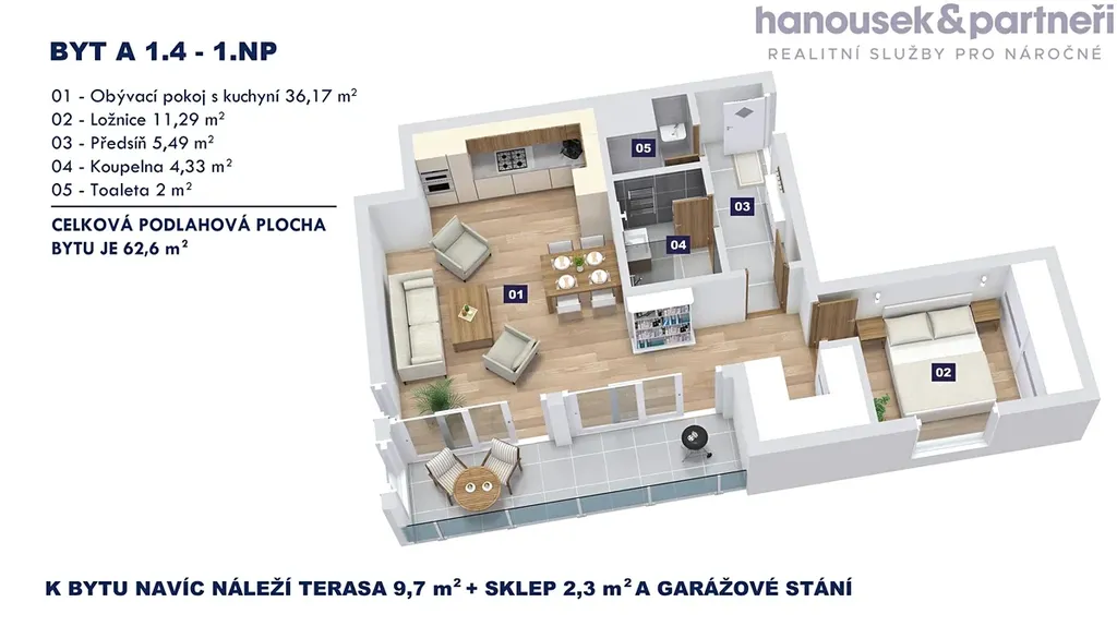 Nabízím vám byt s dispozicí 2+kk o velikosti 62,6 m2. V bytě je obývací pokoj s kuchyní, ložnice, předsíň, koupelna se sprchovým koutem a samostatné WC. Nachází se v 1. patře domu A a navíc k němu patří terasa s výměrou 9,7 m2, sklep a garážové stání.