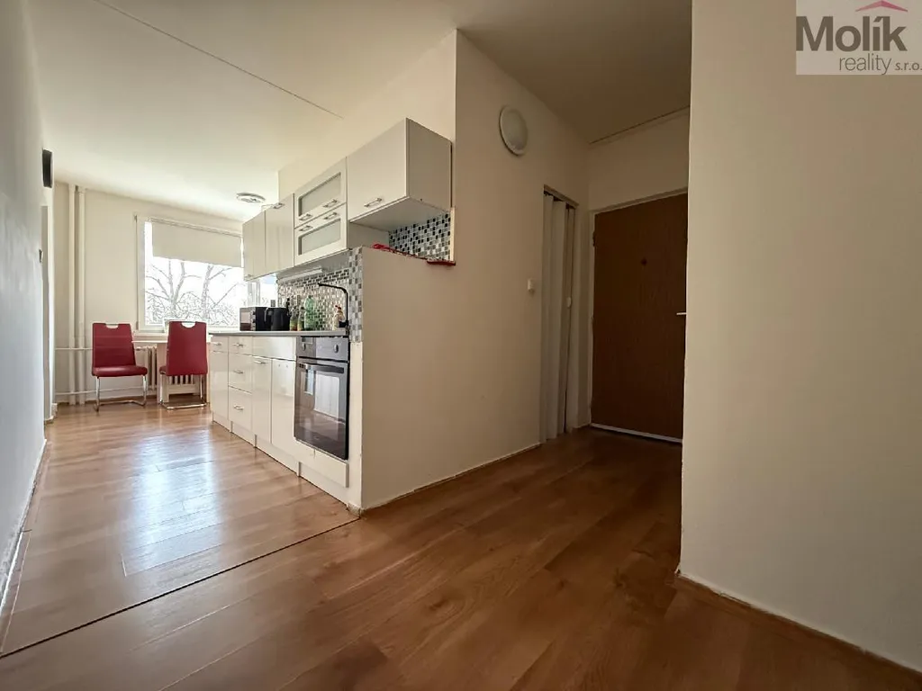 Bytová jednotka prošla úpravami - novější kuchyňská linka (horkovzdušná trouba, indukční varná deska), v celém bytě je položena plovoucí podlaha, zděná koupelna je spojena s toaletou (sprchový kout, keramický obklad a dlažba), stropní světla.