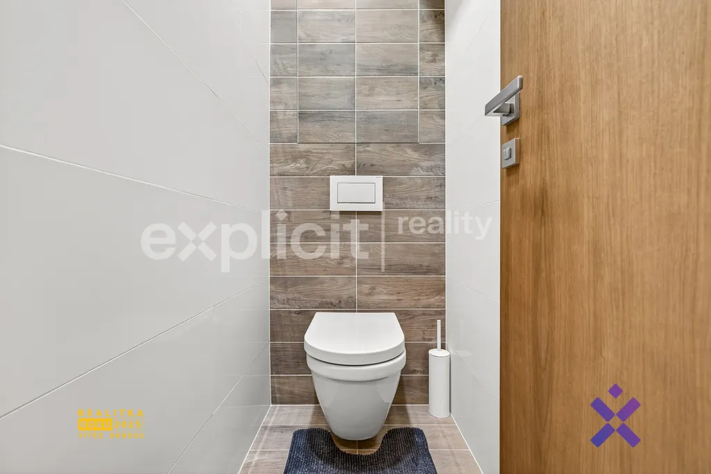 Naproti ložnici a dětskému pokoji je koupelna s vanou, sprchovým koutem a topným žebříkem. Díky světlému obkladu kombinovanému s dekorem dřeva a přítomnosti okna působí prostor vzdušně a prosvětleně. Samostatné WC je umístěno vedle koupelny.