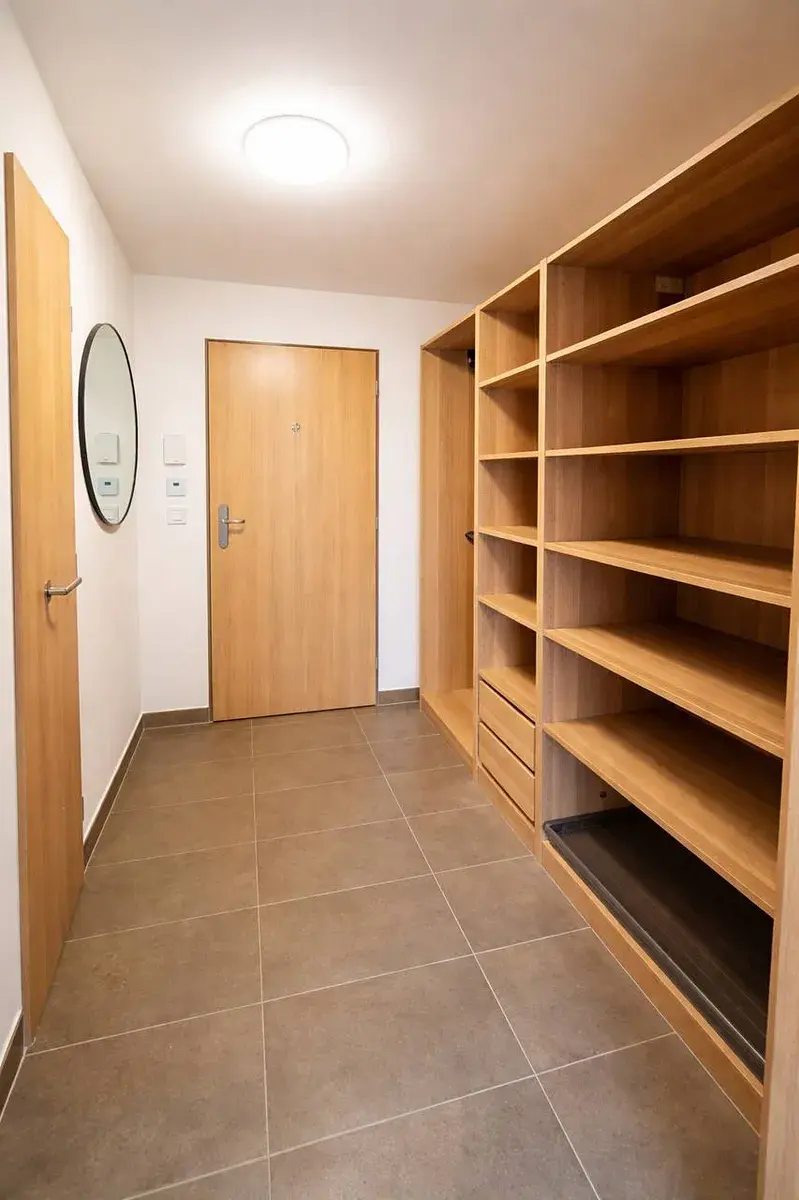 Byt je vybaven vestavěnou skříní a kuchyňskou linkou se všemi spotřebiči. Díky praktickému uspořádání nabízí dostatek úložného prostoru a komfortní bydlení pro jednotlivce či pár.
