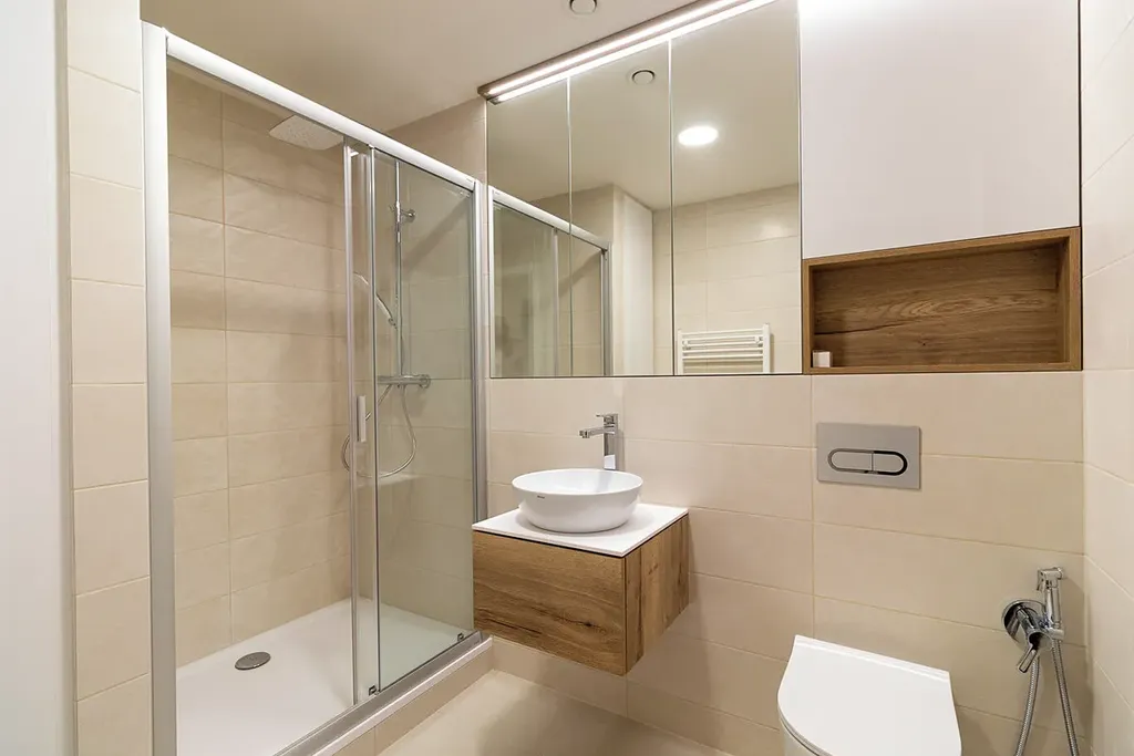Keramika firmy Roca weekend, sanita a baterie od firmy Ravak, lepené vinylové podlahy v obývacím pokoji a ložnici, bílé lakované dveře.