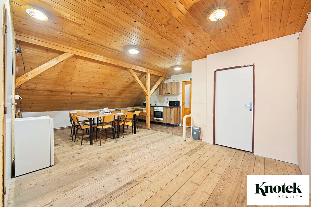 V podkroví jsou 3 kanceláře se sociálním zázemím (kuchyň, wc, sprcha, šatna), užitná plocha činí 66,44 m2.