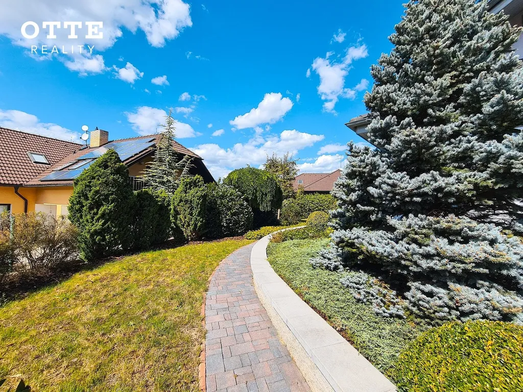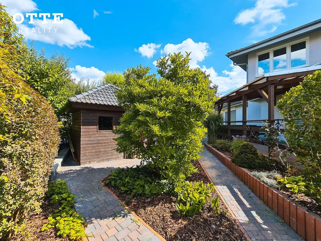 Zahrada je udržovaná se vzrostlou zelení s prostornou, zastřešenou, dřevěnou terasou u domu. V zadní části zahrady je zahradní domek. Celková výměra pozemku je 780 m2. Vjezd na pozemek zajišťují elektricky ovládaná vrata na dálkové ovládání. K parkování je možné používat zastřešené parkovací stání pro dva automobily, před tímto carpointem jsou další parkovací možnosti.