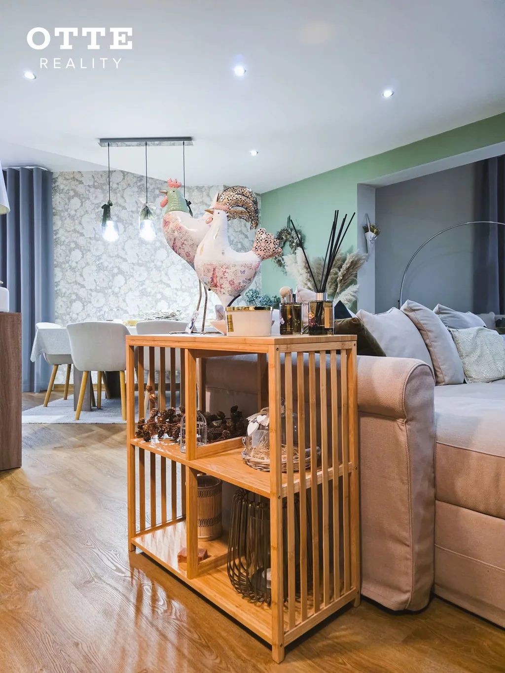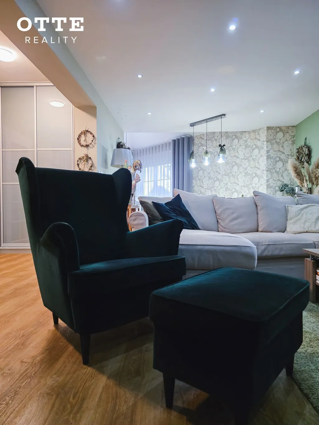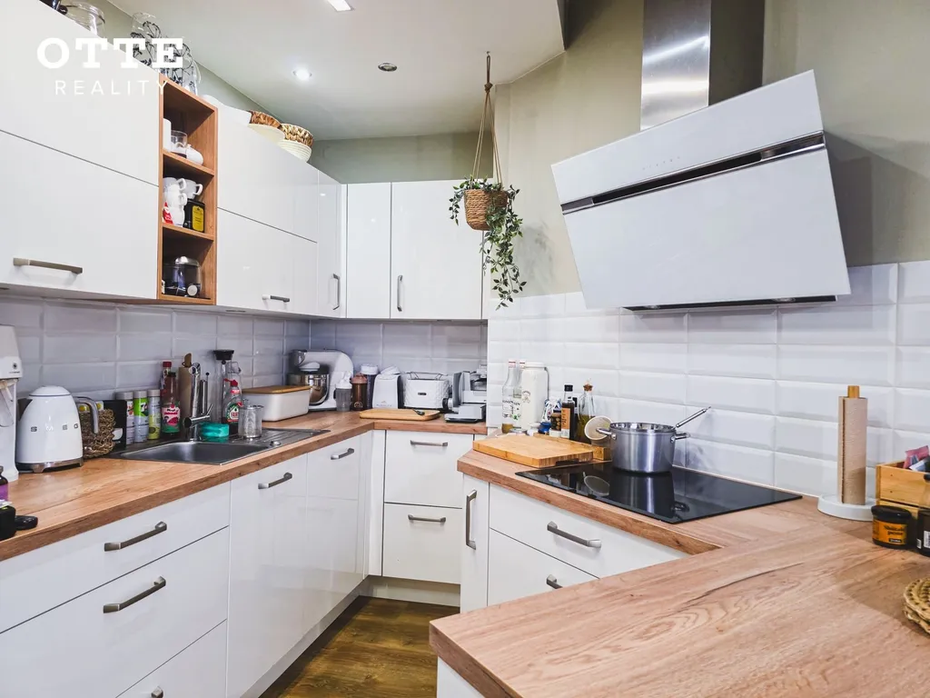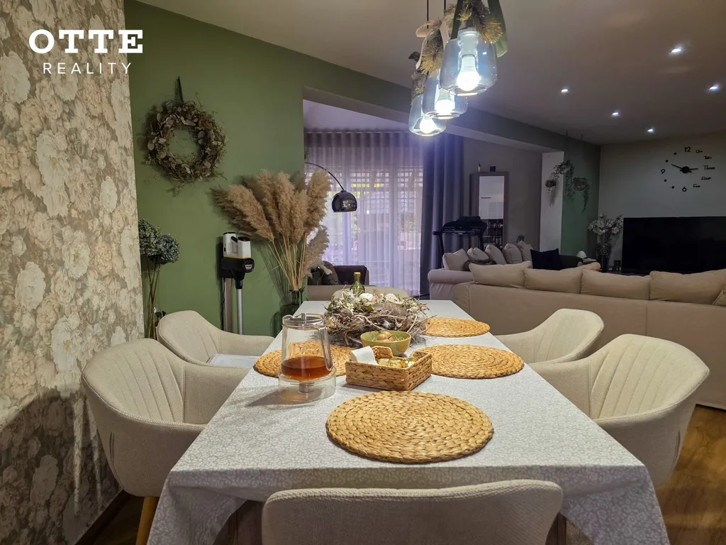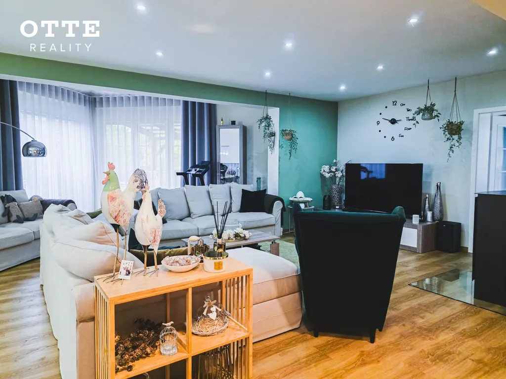 V přízemí domu je vstupní předsíň, chodba se šatní skříní, u které je WC se sprchovým koutem a umyvadlem. Z chodby se vejde do prostorného obývacího pokoje s jídelní a kuchyňskou částí s nově nainstalovanou kuchyňskou linkou včetně vestavěných spotřebičů jako je indukční varná deska, elektrická varná trouba, digestoř, lednice, mikrovlnná trouba nebo např. systém tříděného odpadu. Na obývací prostor navazuje prostor používaný jako zimní zahrada se vstupem na venkovní zastřešenou terasu o velikosti cca 25 m2. Dále je v přízemí domu pracovna s krásným pohledem do zahrady a technická místnost kde je umístěn elektrický bojler, který zajišťuje ohřev teplé vody. Podlahu kryje vinyl a dlažba. V obývacím pokoji jsou krbová kamna a vestavěná skříň.