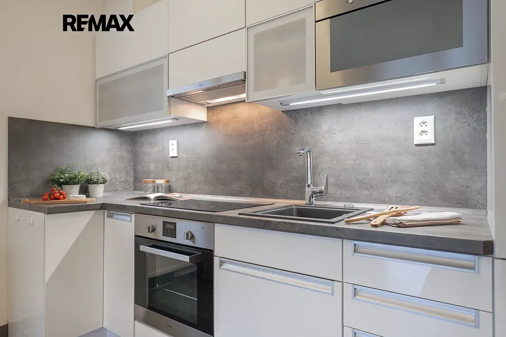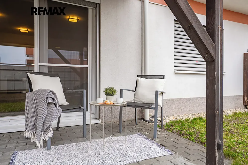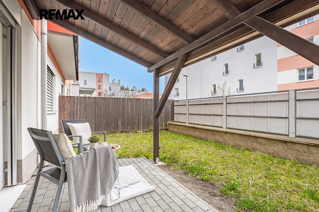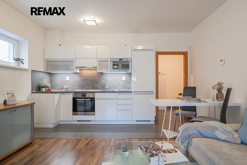 Byt nabízí moderní kuchyňskou linku s vestavěnými spotřebiči, otevřený obývací prostor s jídelním koutem a přímým vstupem na zahradu.