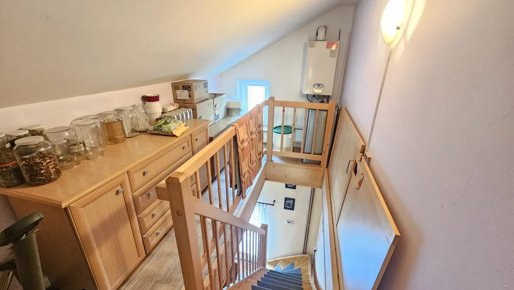 Z obývací části vedou dřevěné schody do horního patra bytu, kde naleznete další obytný prostor s jižní orientací a výhledem na zahradu, chodbu, samostatnou toaletu s umyvadlem a praktický úložný prostor. Dispozice tak nabízí ideální řešení pro rodinu i kombinaci bydlení a práce z domova.
