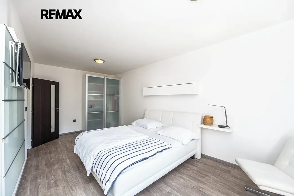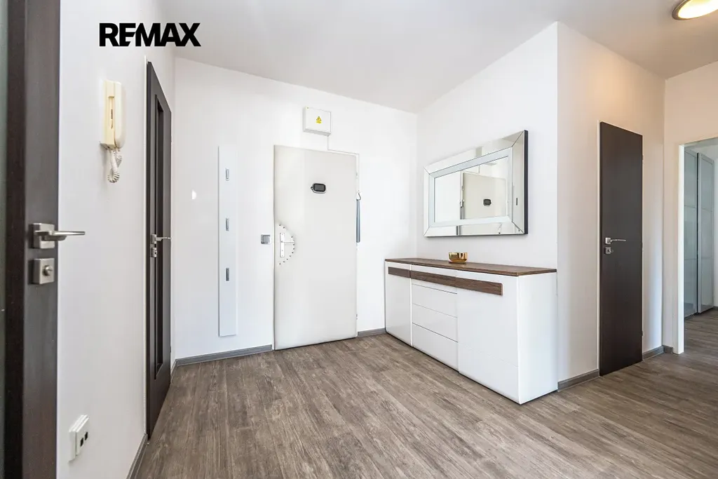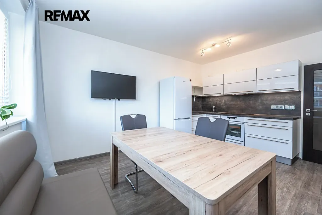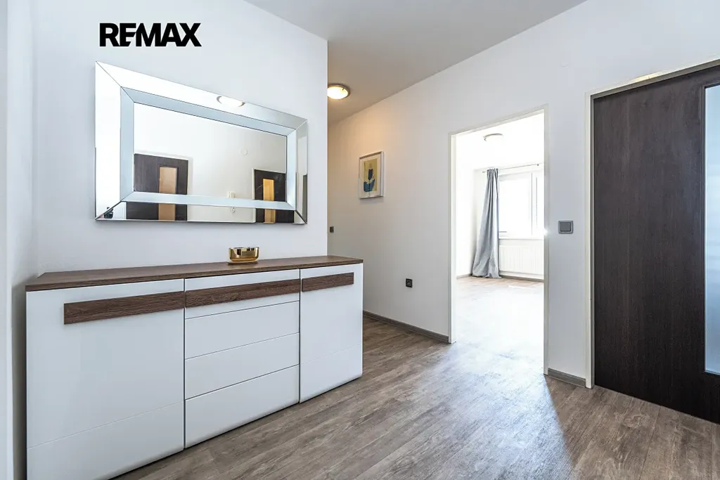 Byt prošel kompletní rekonstrukcí – nové podlahy, kuchyňská linka, koupelna, dveře.
