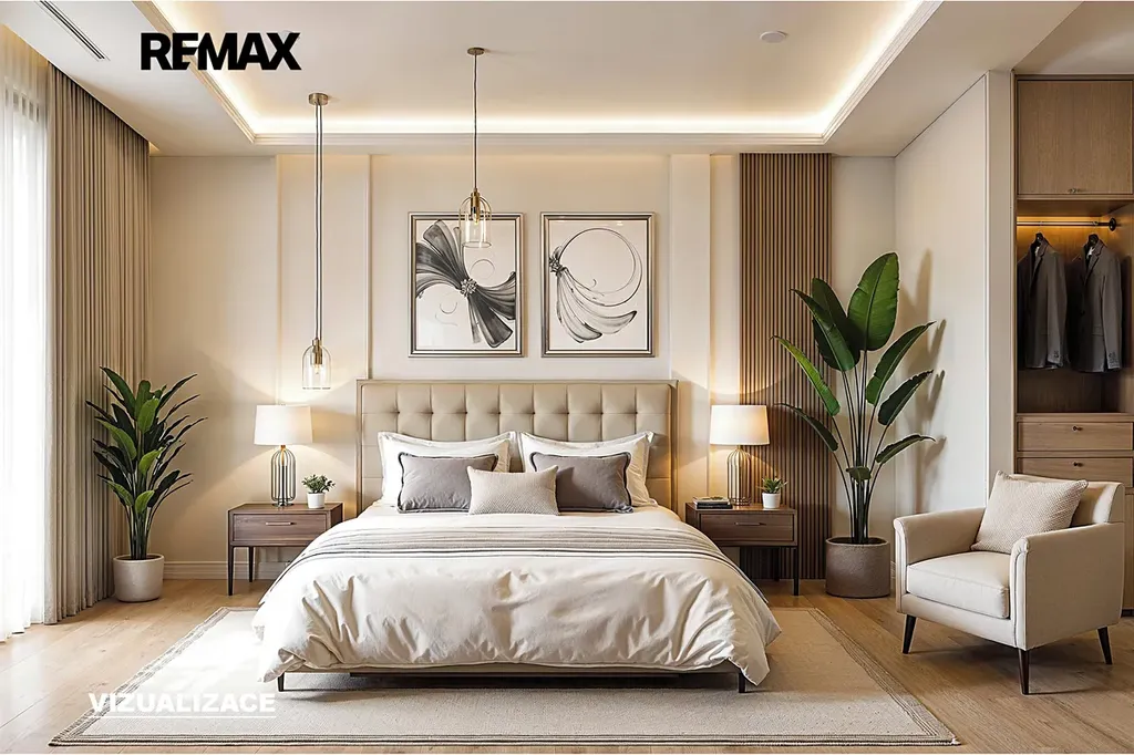 - hlavní ložnice se šatnou a soukromou koupelnou (sprchový kout, WC)