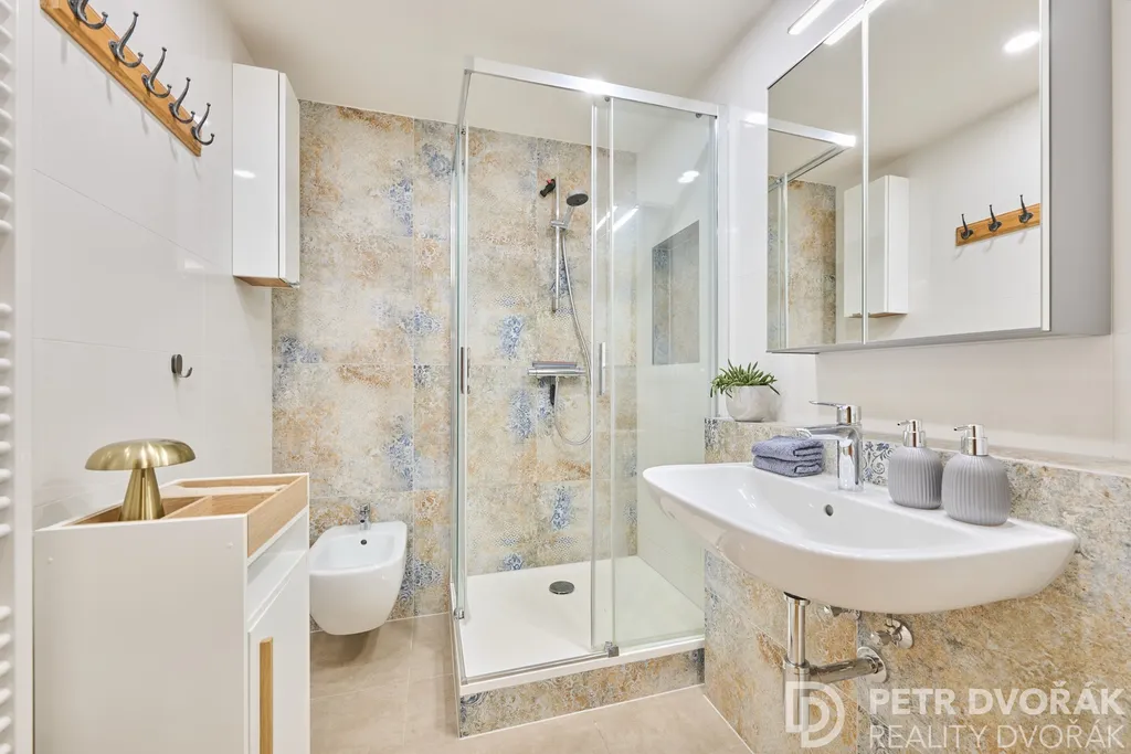 Jihovýchodní část — obývací pokoj s kuchyní a hlavní ložnicí — tvoří světlý celek s výhledem na zeleň. Severozápadní křídlo nabízí klidné prostředí ideální pro práci, dětské pokoje nebo odpočinek. Obě části propojuje prostorná hala. Byt má dvě koupelny, dvě samostatné toalety, bidet a bidetové sprchy — komfort, který se v této kategorii hledá jen výjimečně.