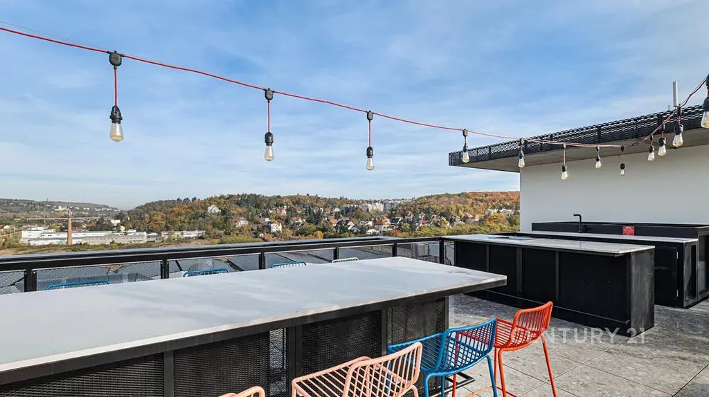 Interiér bytu definuje moderní kuchyňská linka zhotovená na míru v hodnotě přibližně 500 000 Kč, která je estetickým i funkčním centrem domova. Pocit luxusu dotvářejí dřevěné vyhřívané podlahy, klimatizace a velkoformátová trojskla, která do prostoru propouštějí maximum přirozeného světla, zatímco perfektně izolují okolní ruch. Z terasy se otevírá uklidňující výhled do zeleně, ideální pro ranní kávu nebo večerní relaxaci. Obrovským bonusem je pak společná střešní terasa o dvě patra výš – je to naprosto skvělé místo pro odpočinek nebo grilování s přáteli, které nabízí krásné výhledy do okolí.
