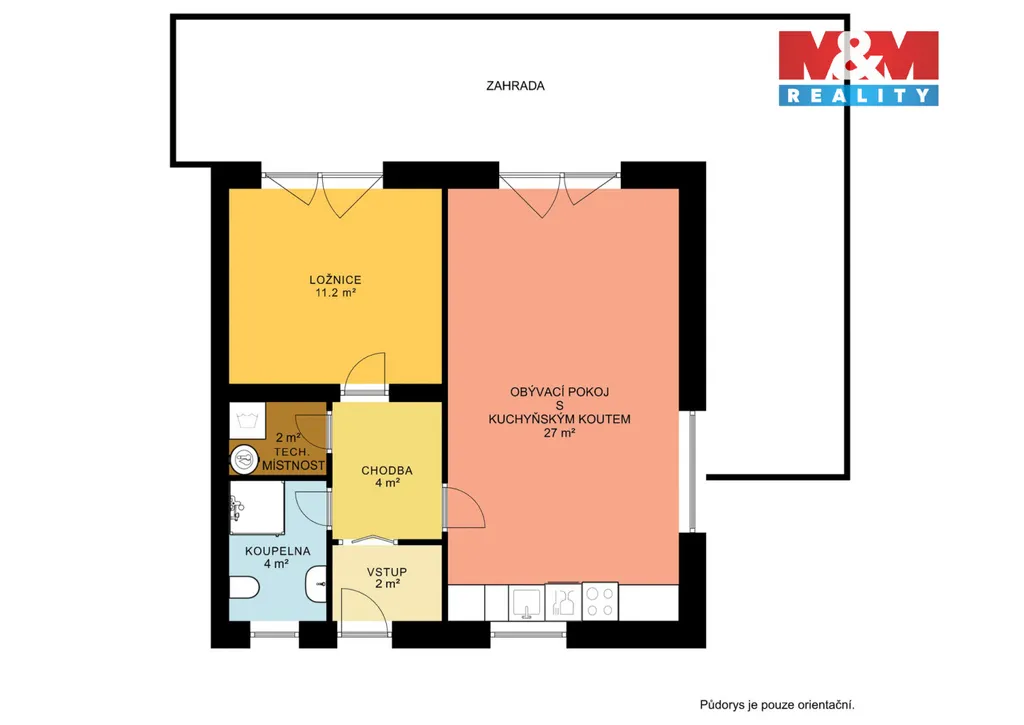 Nabízíme k prodeji slunný byt 2+kk s prostornou zahradou v obci Moravské Knínice. Byt se nachází v přízemí samostatně stojící vily zkolaudované v roce 2017, ve které jsou pouze tři bytové jednotky, což zajišťuje velmi klidné a komorní bydlení. Dispozici tvoří předsíň, obývací pokoj s kuchyňským koutem, samostatná ložnice, koupelna s WC a technická místnost. Velkou předností bytu je soukromá a prostorná zahrada, na kterou je přímý vstup jak z obývacího pokoje, tak i z ložnice. Nabízí příjemné místo pro relaxaci, posezení s rodinou či přáteli nebo letní grilování. Součástí bytu je také vlastní parkovací stání přímo u domu. Kuchyňská linka je vybavená. Podlahové topení je v obývacím pokoji s kuchyní a v předsíni, v ostatních místnostech jsou přímotopy. Ohřev vody zajišťuje bojler. Okna jsou plastová s trojskly a elektrickými venkovními roletami. Energetická náročnost budovy je třídy B. Byt nabízí příjemné bydlení s výbornou dostupností do Brna a je vhodný i jako investice.