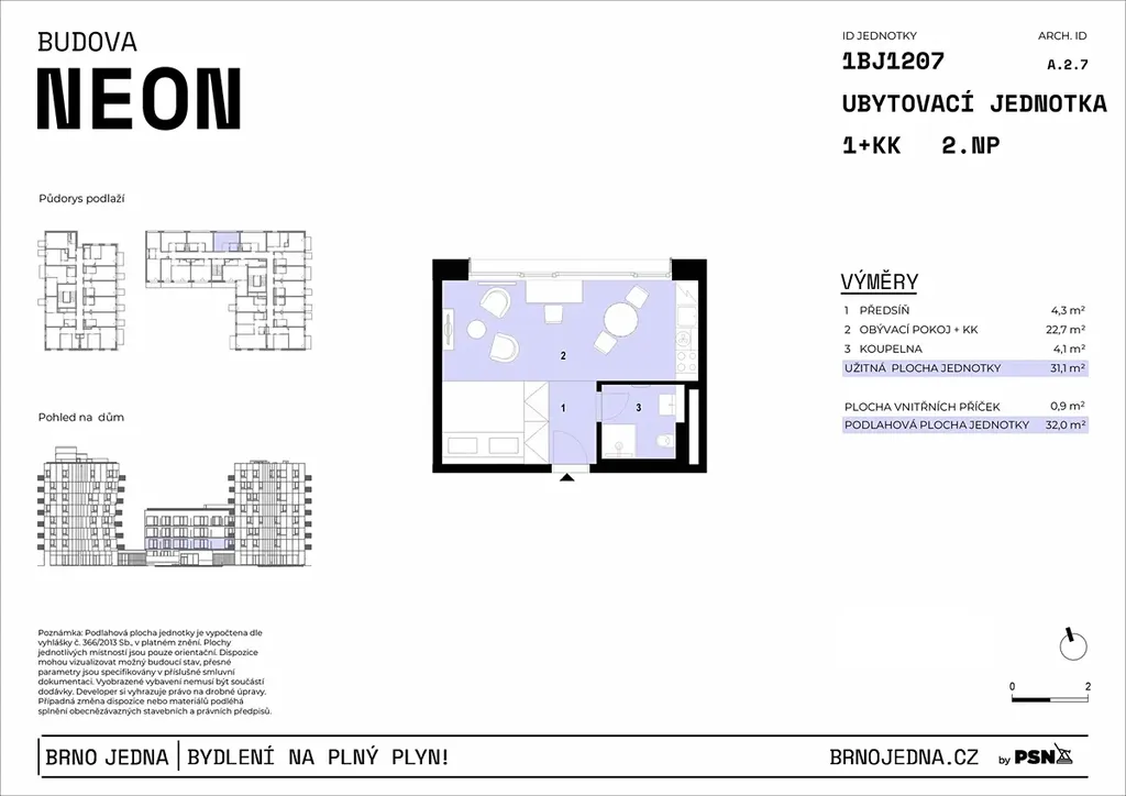 Jednotka č. 1207 o dispozici 1+kk a celkové ploše 32 m² vám nabídne harmonický prostor pro život, ať už hledáte vlastní zázemí, nebo investiční příležitost. Jednotka v 2. podlaží zahrnuje obytný prostor s přípravou na kuchyňský kout, elegantní koupelnu se sprchovým koutem a toaletou a vstupní část s místem pro úložné řešení. K jednotce je třeba zakoupit sklepní kóji a parkovací stání. Byt bude připraven k okamžitému nastěhování s dokončenými podlahami, vybavenou koupelnou a připraveným prostorem pro kuchyňskou linku. Vyšší standard zahrnuje kvalitní materiály, trojskla a u vybraných jednotek i přípravu na venkovní stínění.