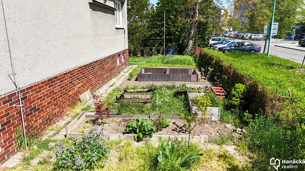 Pozemek je oplocen, každý byt má k dispozici jeden záhon k pěstování, v suterénu je také společná kolárna.