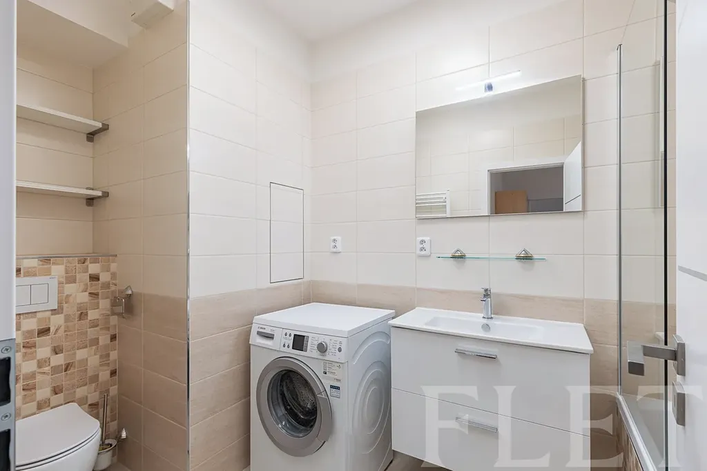 Dispozice bytu zahrnuje obývací pokoj s kuchyňským koutem a samostatnou ložnici. Kuchyňská linka je vybavena varnou deskou, troubou, digestoří a lednicí s mrazákem. Součástí prostoru je také barový stolek se dvěma židlemi. V předsíni se nachází vestavěné skříně a další úložné prostory. Praktickým benefitem bytu je samostatná šatna s policovým systémem, která nabízí dostatek místa pro uložení věcí. Koupelna je po kompletní rekonstrukci a disponuje vanou, toaletou, umyvadlem, pračkou, úložnými skříňkami a topným žebříkem.