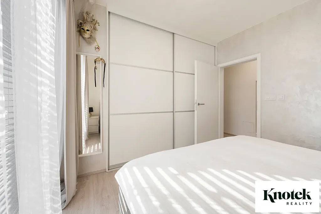 Byt je vybaven kvalitní kuchyňskou linkou se spotřebiči a ostrůvkem. V ložnici a v chodbě jsou vestavěné skříně na míru. V koupelně s odvětráváním je vana, WC a dostatek místa pro pračku i sušičku. Plastová okna s trojskly disponují venkovními žaluziemi ovládanými přes chytrou domácnost, což společně s kvalitní izolací udržuje stabilní teplotu v bytě. Ústřední vytápění a ohřev vody jsou zajištěny prostřednictvím výměníkové stanice v domě. V jednotlivých místnostech jsou radiátory, v koupelně je topný žebřík.