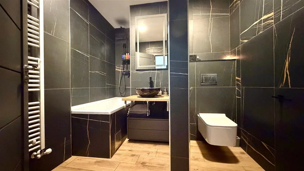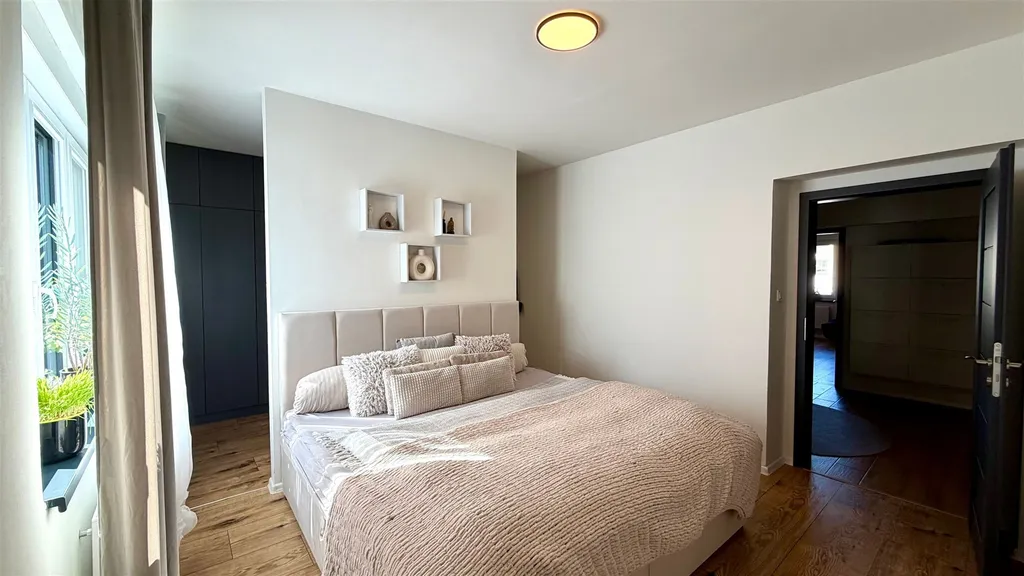 Byt tvoří prostorná předsíň, obývací část s kuchyňským a jídelním koutem, ložnice s praktickou šatnou, kde najdeme na zakázku vyrobenou vestavěnou skříň, dále další pokoj a koupelna s toaletou. Součástí prodeje je moderní kuchyňská linka s vestavěnými spotřebiči. Ohřev vody a vytápění bytu je řešeno úsporným plynovým kondenzačním kotlem. K bytu náleží sklep o výměře 6 m2 a půdní kóje.
