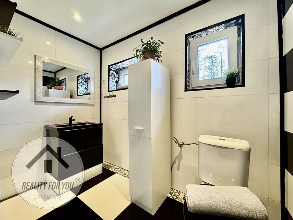V přízemí se nachází prostorný obývací pokoj s kuchyní (cca 45 m2), který byl velmi vkusně rekonstruován a nabízí přímý vstup na zahradu. Ložnice má velmi šikovné rozložení na spací část s volným výhledem na pozemek a nabízí i dostatkem prostor pro šatnu. Koupelna se sprchovým koutem, toaletou a zázemím pro pračku, sušičku a úložný prostor.