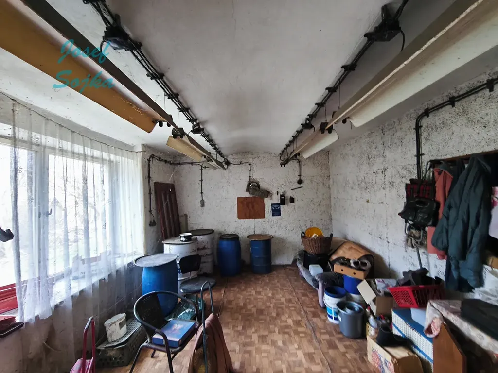 vstupní chodba, kuchyně 16m2, pokoj 25m2, koupelna s WC 3m2, spížka 3 m2. Z chodby je přístup na prostornou půdu, kde se nabízí prostor pro další obytné místnosti. Na dům navazuje chlév a dílna.