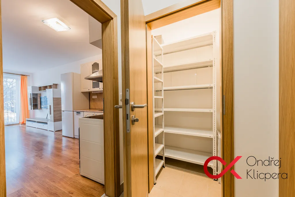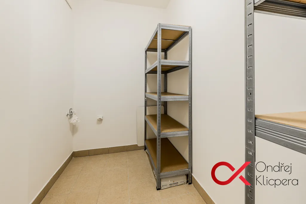 Chodba s prostornou vestavěnou skříní, koupelna se sprchovým koutem a toaletou, komora s regály i prostorem pro pračku a sušičku a spíž s regály.