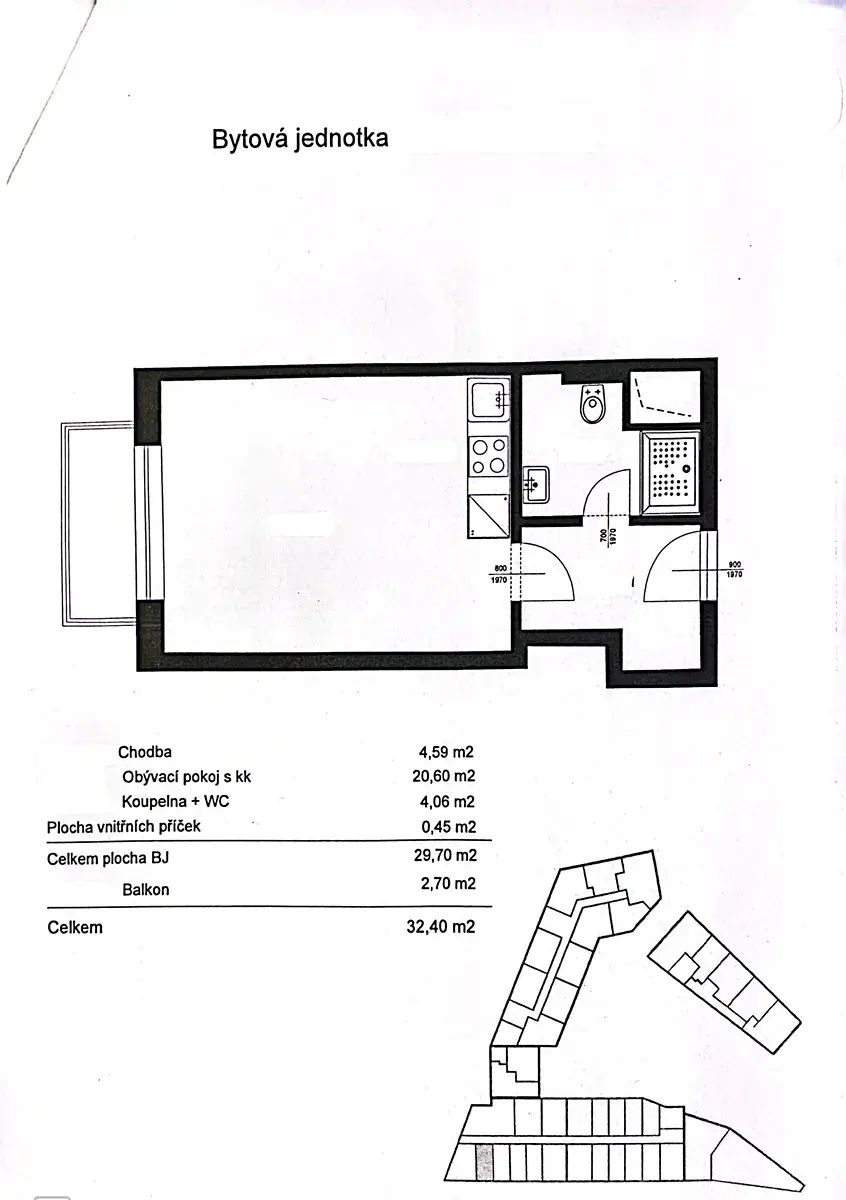 Byt je situovaný v 4. NP v novostavbě o celkové výměře 34 m2 včetně balkonu.