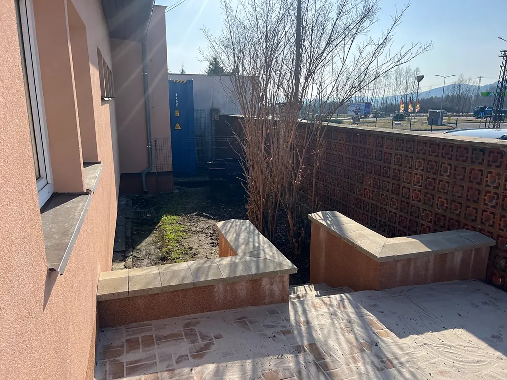 Celý prostor provozovny je velmi prakticky řešen. Přední vstup z parkoviště s malou zahradou před domem vás uvede do domu, kde se po pravé straně nachází kancelář a po levé straně kuchyňka a z ní vstup do sprchy. Z chodby pak po levé straně najdete vstup do úklidové místnosti a na WC. Z chodby vstupujete přímo do provozovny, která je ve tvaru L, dobře prosvětlena okny z obou stran. Vpravo po vstupu do provozovny jsou dveře do skladu.