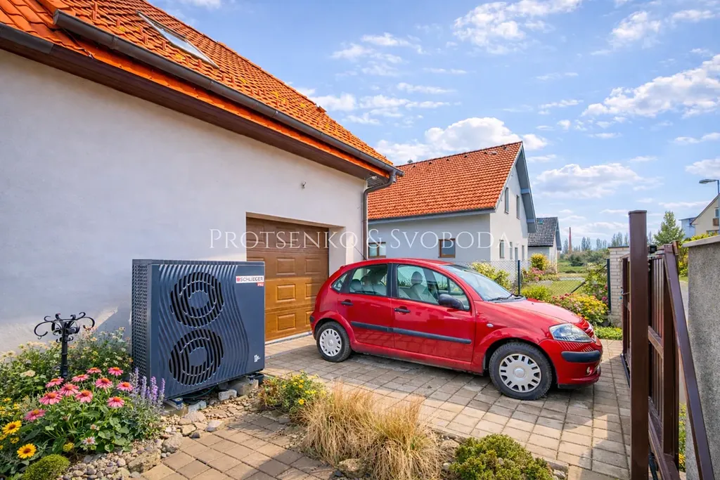 Velkým benefitem domu je také tepelné čerpadlo, které přináší komfortní a úsporné řešení vytápění a zvyšuje celkovou hospodárnost provozu. Díky tomu dům nabízí nejen příjemné bydlení, ale i moderní technické zázemí odpovídající dnešním nárokům na efektivitu a pohodlí.