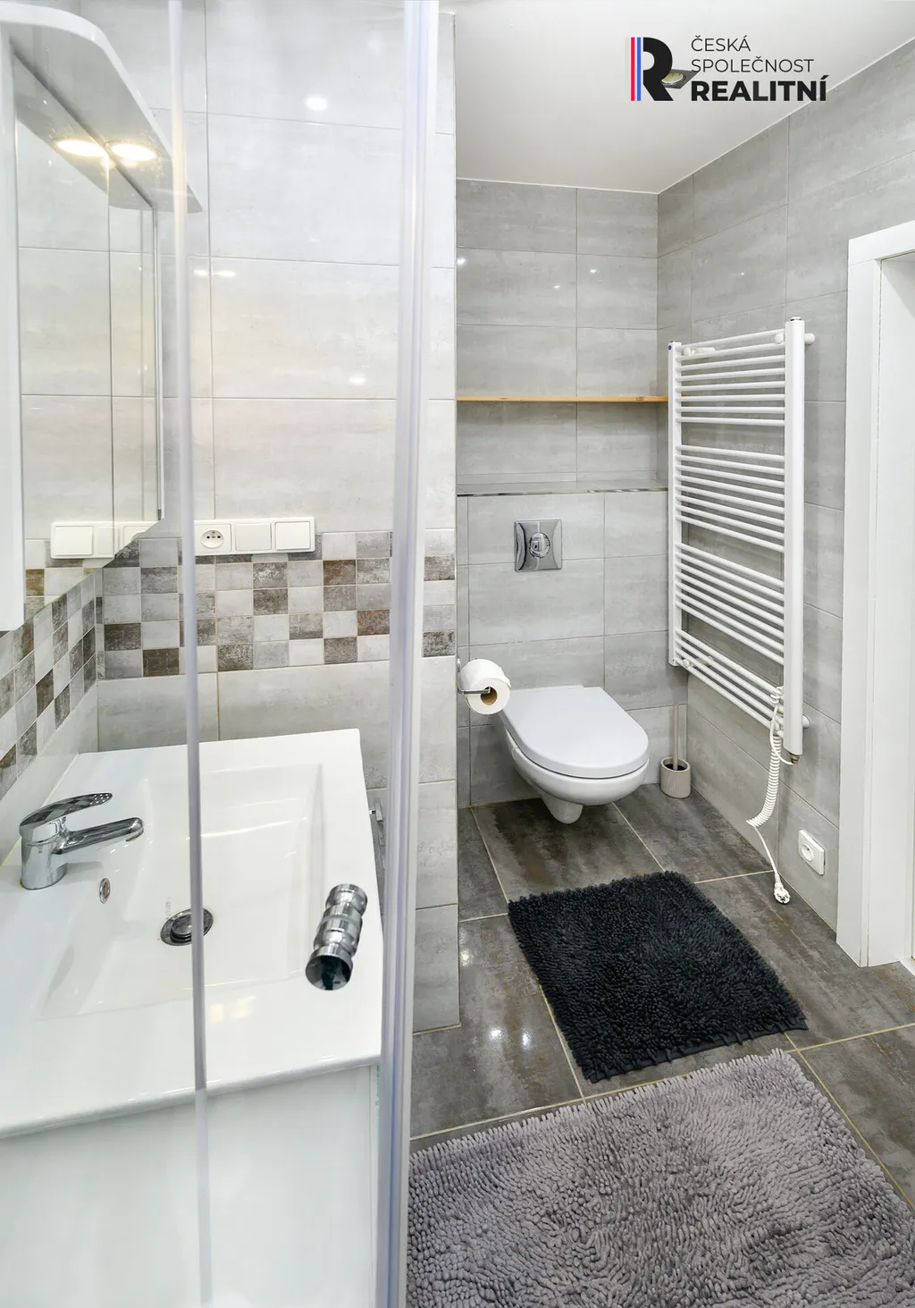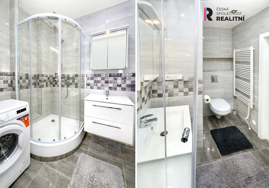 Koupelna se sprchovým koutem, WC a pračkou.