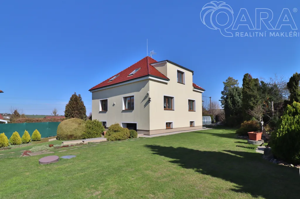 Exteriér domu je skutečnou předností – zahrada o rozloze cca 1 367 m² je vybavena okrasným jezírkem, skleníkem a krytým, vyhřívaným bazénem (6,4 × 4,2 m, hloubka 1,6 m), který lze využívat od jara do podzimu. Nechybí ani automatická závlaha napojená na retenční nádrže - 10 m3 a 13 m3, dvě studny (kopaná 29 m a vrtaná 42 m) a moderní čistička odpadních vod (Biova - 2024).