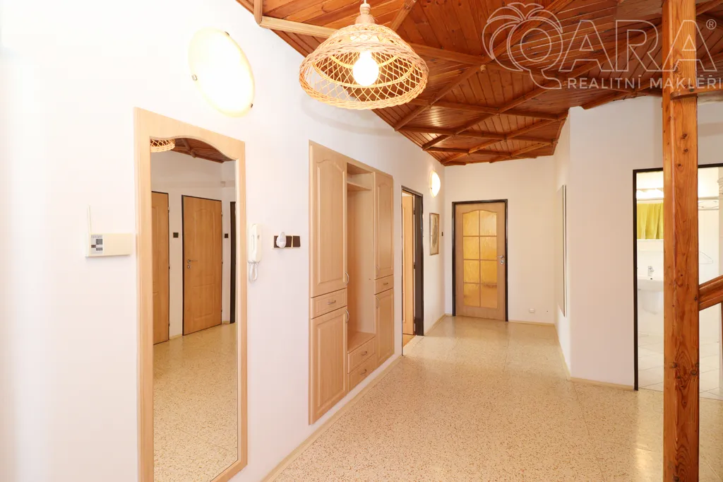 V suterénu domu se nachází prostorná garáž pro dvě auta (40 m²) spolu s technickým zázemím, sklepem, skladem a prádelnou. Přízemí tvoří světlý obývací pokoj propojený s plně vybavenou kuchyní o celkové ploše 42 m², dále pokoj vhodný jako pracovna či pokoj pro hosty, vstupní hala, samostatná toaleta a praktická spíž. V patře je k dispozici hala se vstupem do tří ložnic, druhý obývací pokoj, koupelna s toaletou a šatna.