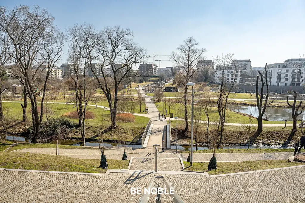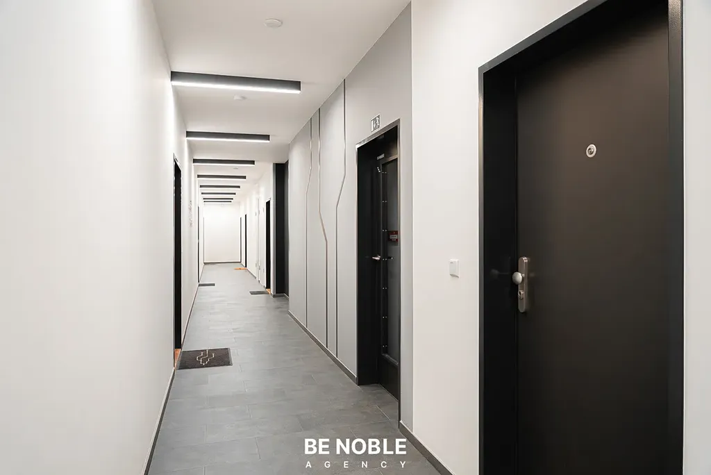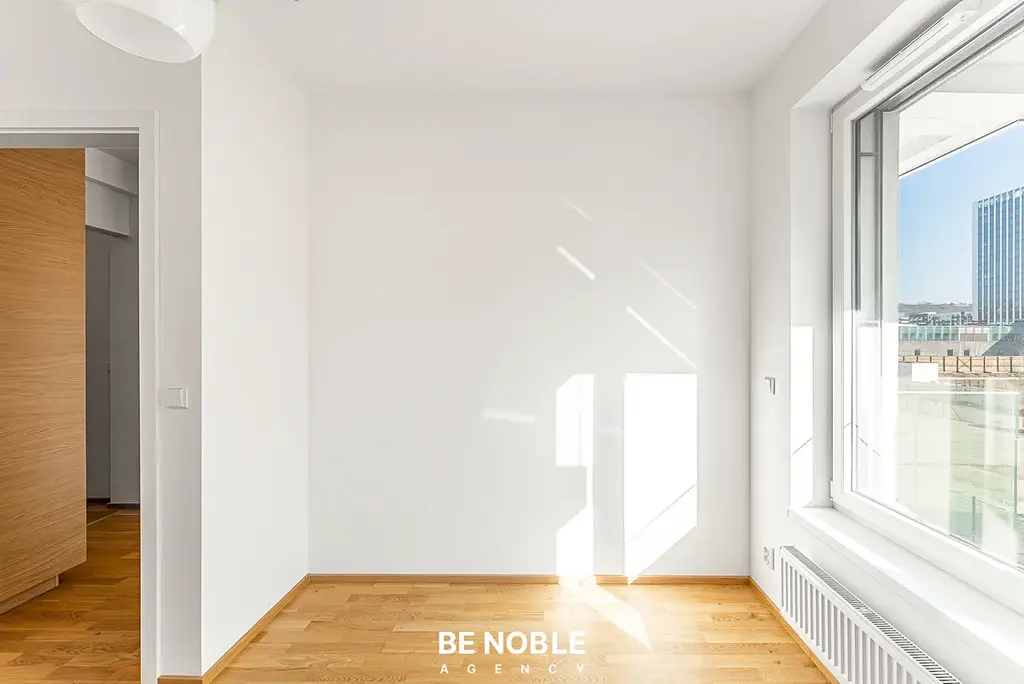 Standard bytu podtrhují dřevěné podlahy, stropy o výšce 2,67 m a elektronicky řízené venkovní žaluzie. Koupelna (4,2 m²) je vybavena sprchovým koutem a připravena na umístění pračky se sušičkou. Byt je zcela nový a připraven k okamžitému nastěhování.
