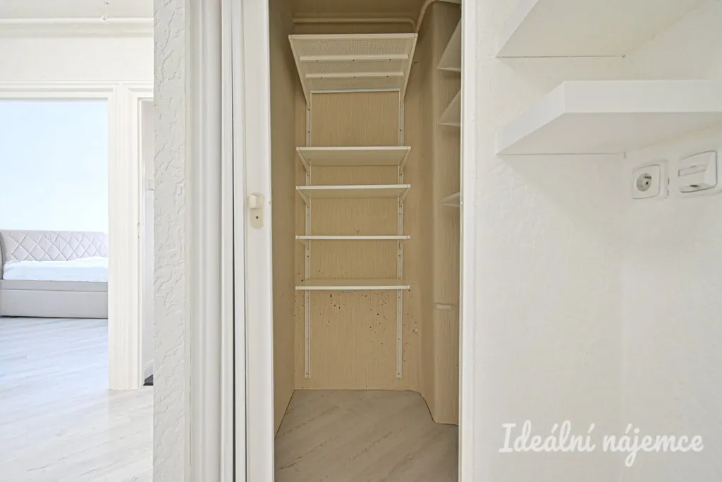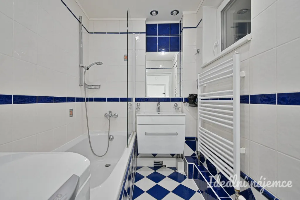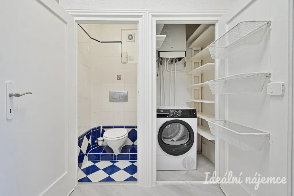 Byt nabízí praktické řešení. K dispozici je ložnice, obývací pokoj a kuchyně vybavená kuchyňskou linkou se spotřebiči. Koupelna disponuje vanou a pračkou, toaleta je samostatná. Velkým benefitem je také technická místnost se sušičkou a menší šatna, které výrazně rozšiřují úložné možnosti bytu a zvyšují komfort každodenního bydlení.