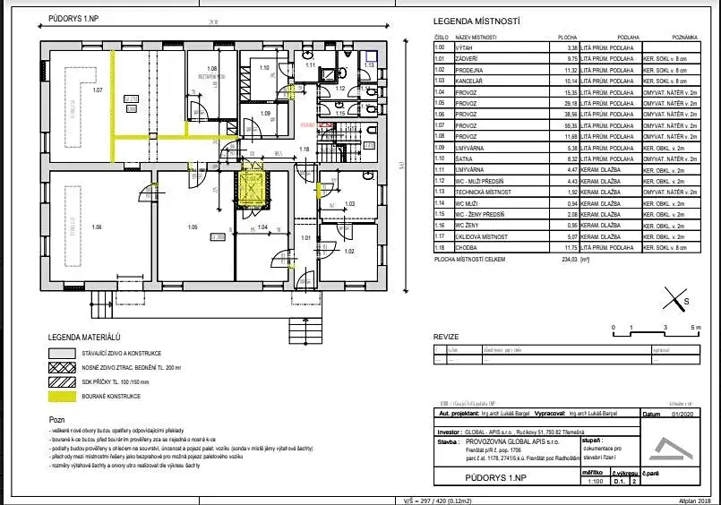 - 1. NP – o zastavěné ploše 296,99 m2 a podlahové ploše 233,27 m2 má tyto prostory: Zádveří 9,75 m2, výtah 3,38 m2, prodejna 11,32 m2, kancelář 10,14 m2, výrobní prostor 15,35 m2, výrobní prostor 29,60 m2, výrobní prostor 38,56 m2, výrobní prostor 59,35 m2, výrobní prostor 11,68 m2, výrobní prostor 5,38 m2, šatna 8,32 m2, umývárna 4,47 m2, WC muži předsíň 4,43 m2, technická místnost 1.92 m2, WC muži 0,94 m2, WC ženy předsíň 2,08 m2, WC ženy 0,95 m2, úklidová místnost 5,07 m2 a chodba 10,57 m2.