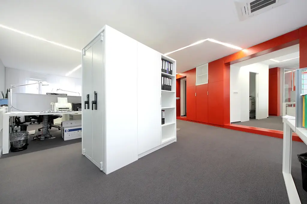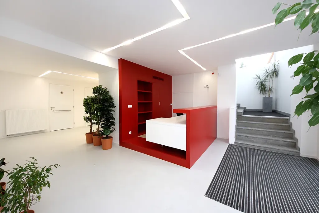 V suterénu recepce, technické místnosti, sklad a garáže.