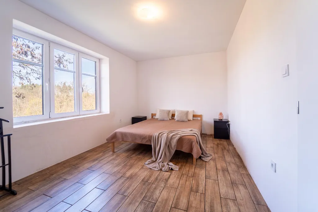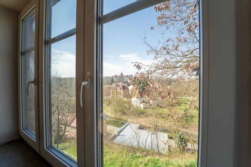 První a druhé nadzemní podlaží prošly zásadní modernizací. Dominantou je otevřený obytný prostor s kuchyní, který propojuje první a druhé podlaží a dodává interiéru nevšední industriální charakter s výraznými architektonickými prvky. Celý prostor působí velkoryse, světle a zároveň velmi útulně. Součástí prvního nadzemního podlaží jsou dále dva samostatné pokoje a praktická šatna, které poskytují dostatek soukromí i úložného prostoru. Z obývací části je přímý vstup na balkon o velikosti 5 m2 a z kuchyně pak na prostornou terasu, která čeká na dokončení. Z obou těchto míst se otevírá okouzlující výhled na zámek a okolní krajinu, který dodává tomuto místu skutečně výjimečnou atmosféru.