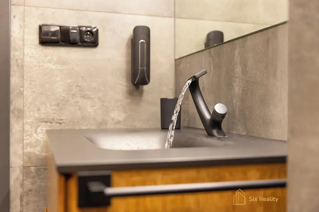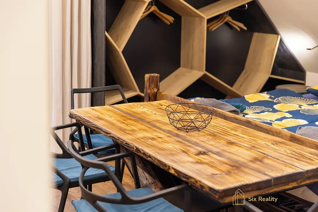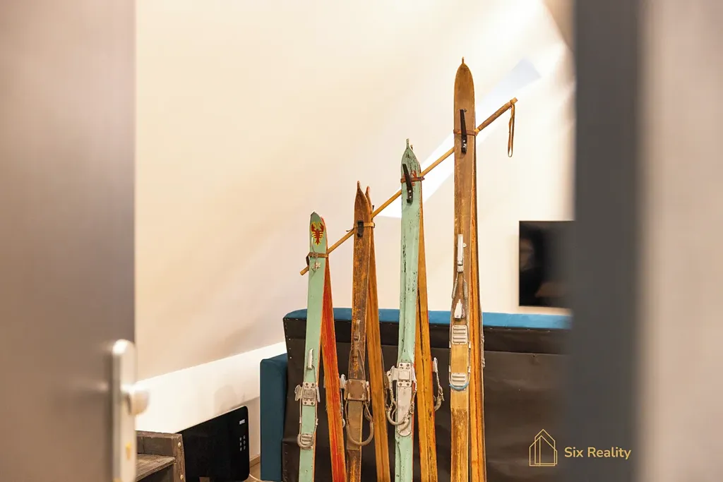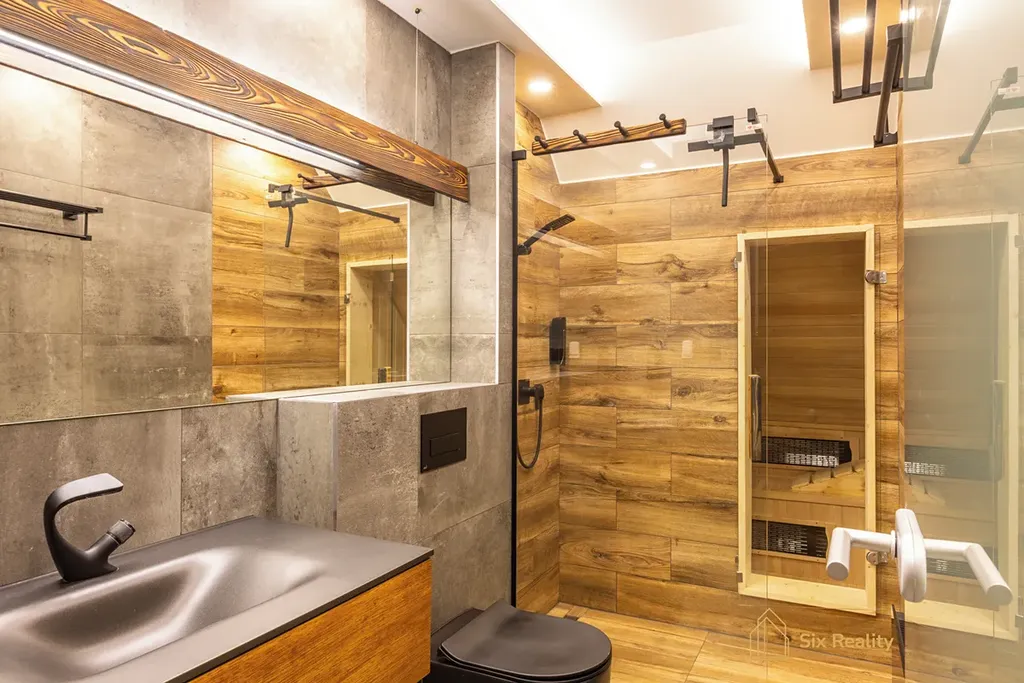 Máme pro Vás připravený útulný apartmán v podkroví o dispozici 1kk a velikosti 45 m2 v nově dokončeném projektu a to přímo u sjezdovky SKI areálu Plešivec. Centrem celého bytu je prosvětlený obývací pokoj s kuchyní na míru, která se opravdu povedla, a prostor, který plní funkci ložnice s velkou manželskou postelí. Dále zde najdeme i vstup na nadstandardní balkon, odkud budete mít krásný výhled do krajiny, nebo na obec Abertamy a možnost si tak vychutnat klid a pohodu s něčím dobrým v ruce. Ze středu bytu se po žebříku dostaneme do úplného podkroví celého apartmánu, kde najdeme soukromí a útulno v podobě ložnice pro dvě osoby. Ale myslím, ze tady se bude líbit hlavně dětem. Koupelna s černými prvky je vkusně dokončená a právě ty podtrhují originalitu a osobitost celého apartmánu. Největším benefitem pak pro Vás bude soukromá sauna, která je přístupná přímo z koupelny. Veškeré interiérové vybavení je ruční výroba masivního nábytku s důrazem na přirozenou krásu dřeva.