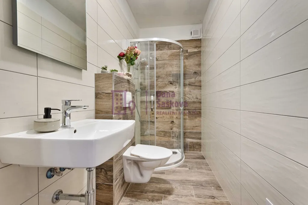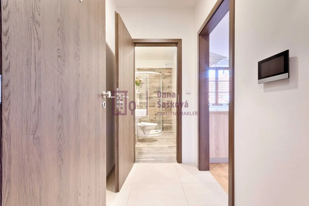 Dispozice 1+kk nabízí pokoj s kuchyňský koutem a koupelnu se sprchovým koutem a toaletou.