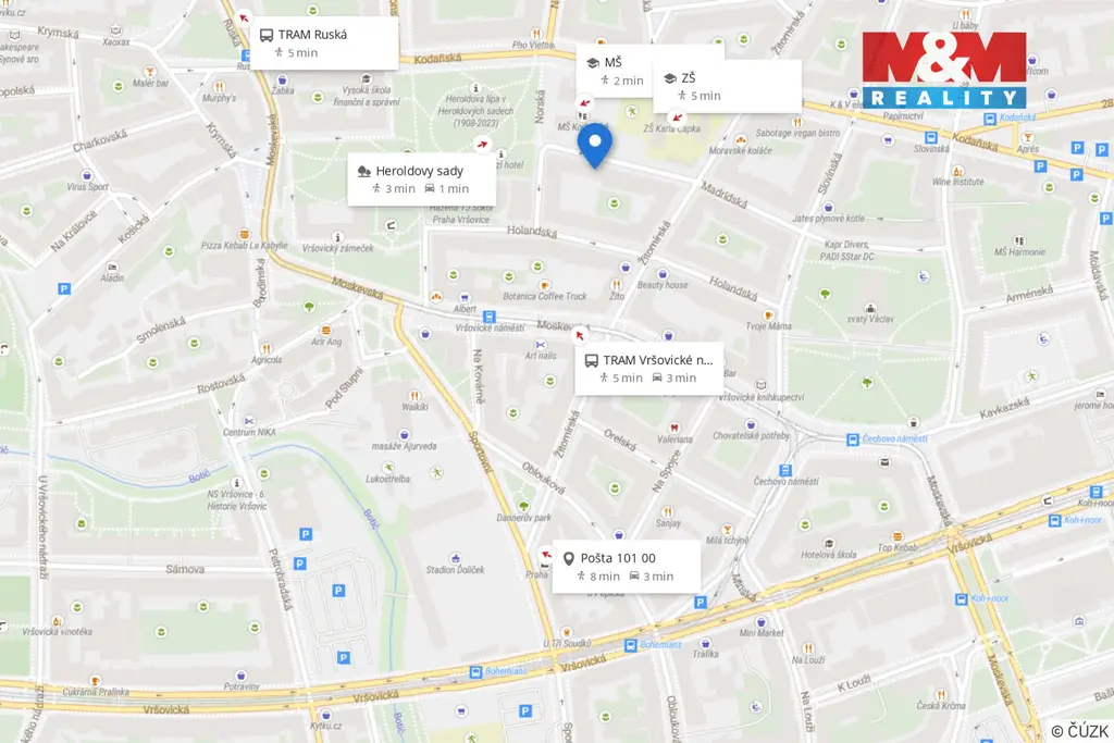 Vršovice patří mezi oblíbené rezidenční čtvrti s kompletní občanskou vybaveností v docházkové vzdálenosti – obchody, restaurace, kavárny, školy i zdravotnická zařízení. V blízkosti jsou parky Heroldovy sady a Havlíčkovy sady (Grébovka), vhodné pro relax i sport. Výborná je dopravní dostupnost, tram zastávka Vršovické náměstí jen 3 min chůze.