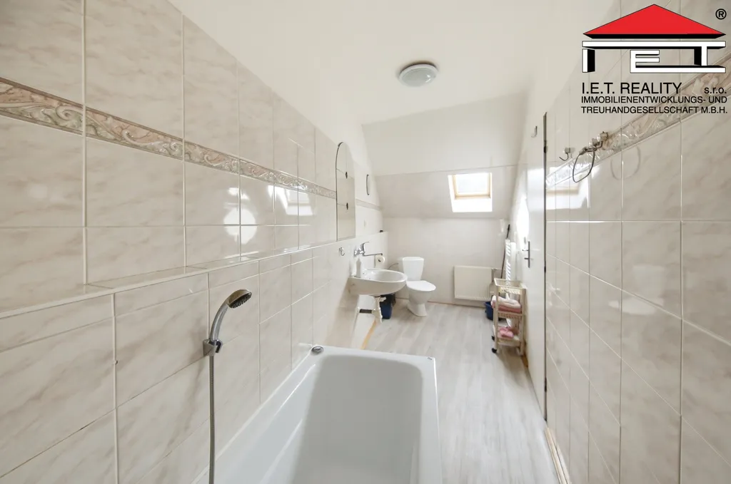 Vila II. - V prostřední budově se nachází plně vybavená kuchyně s barem a výčepním zařízením na pivo-limo, která je volně spojena s prostornou jídelnou (76 m2), gaučem a francouzskými dveřmi do zahrady, WC a koupelna se sprchovým koutem a infrasaunou. Pro ubytování jsou v prvním patře tři dvoulůžkové pokoje, koupelna s rohovou vanou a WC. Ve dvou ložnicích je možnost plnohodnotné přistýlky. Lze ubytovat opět až 8 osob.