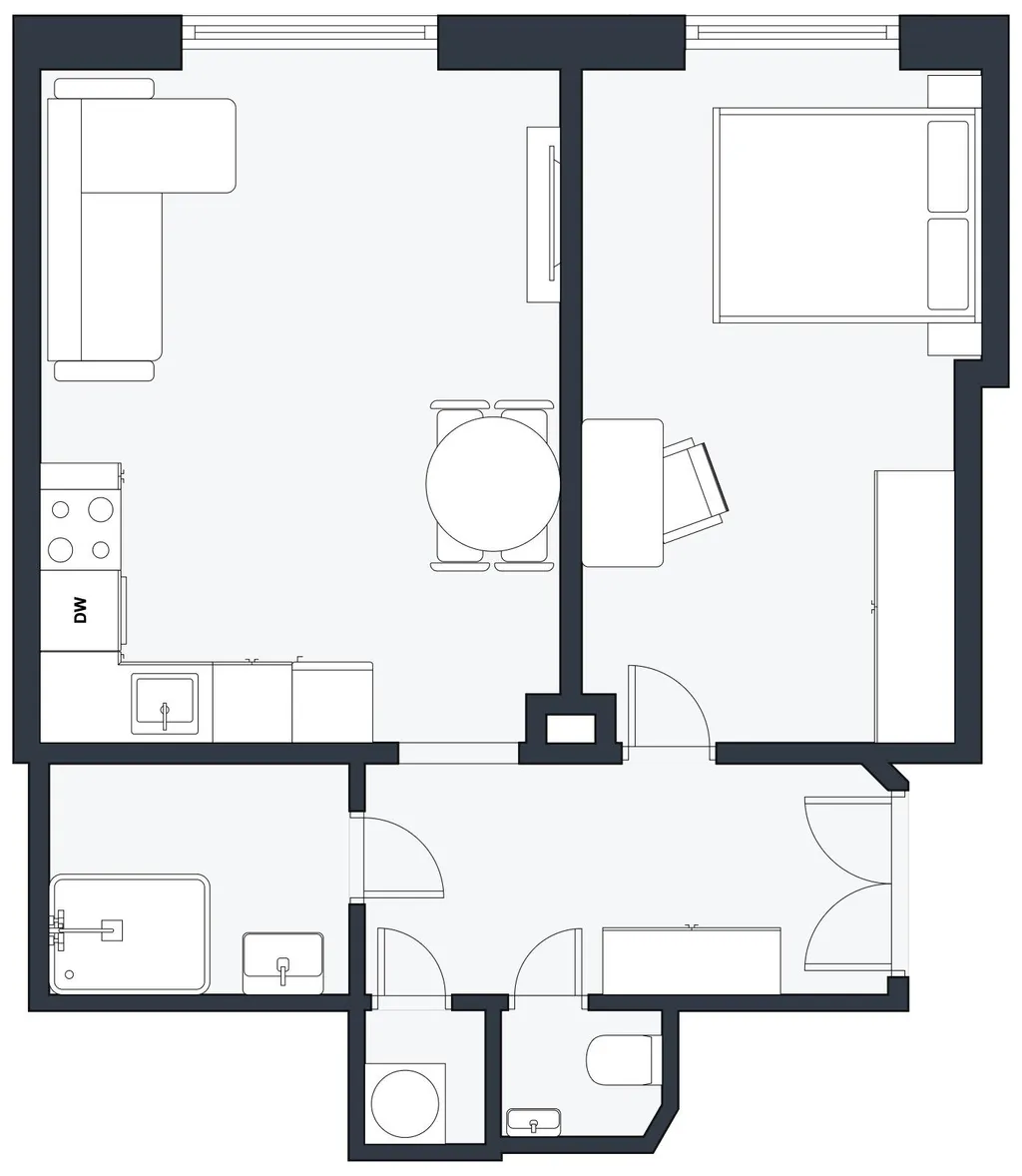 Dispozici bytu tvoří obývací pokoj s kuchyňským koutem, samostatná ložnice, moderní koupelna se sprchovým koutem, samostatná toaleta, technická místnost a prostornější chodba s dostatkem úložného prostoru.