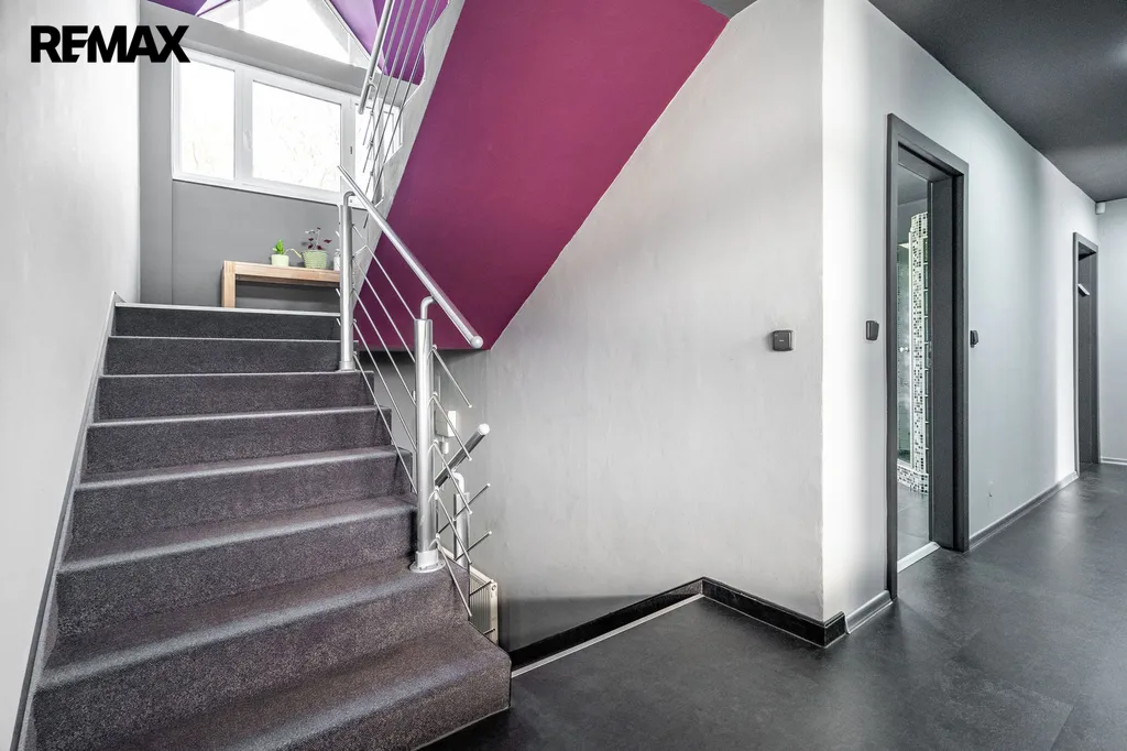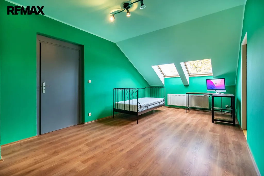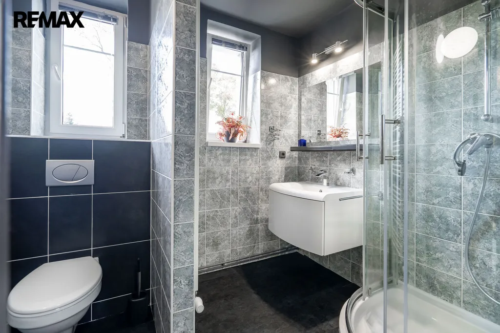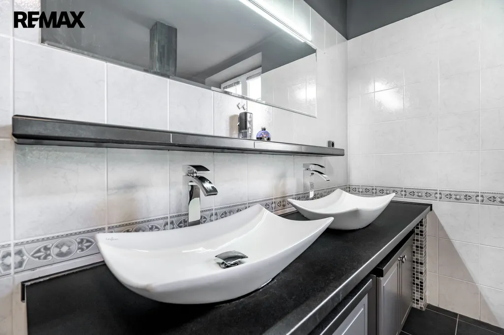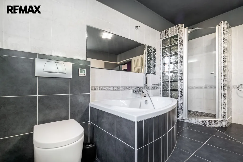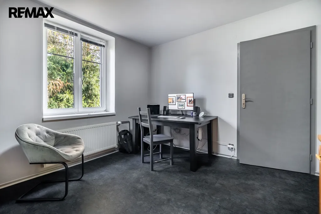 V přízemí se nachází obývací pokoj propojený s kuchyňským koutem a jídelnou, což vytváří ideální prostor pro společné chvíle s rodinou či přáteli. Dále zde najdete hlavní ložnici s šatnou, samostatnou pracovnu pro klidný home office a prostornou koupelnu s vanou. Na druhé straně domu je k dispozici prádelna, další ložnice a koupelna se sprchovým koutem.