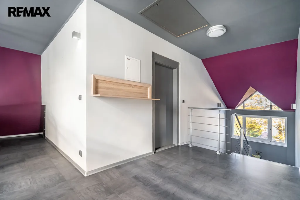 V patře se nacházejí dva dispozičně identické prostory. Každý z nich nabízí ložnici s vlastní koupelnou a šatnou a další místnost, kterou lze využít jako pracovnu nebo ji případně upravit na menší kuchyň. Díky tomu je možné ve druhém patře vytvořit dvě samostatné bytové jednotky.