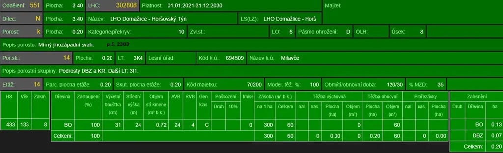 - p.č. 2383 vedená jako lesní pozemek o celkové výměře 1 944 m2 (stáří lesa 138 let - zastoupení dřevin borovice),