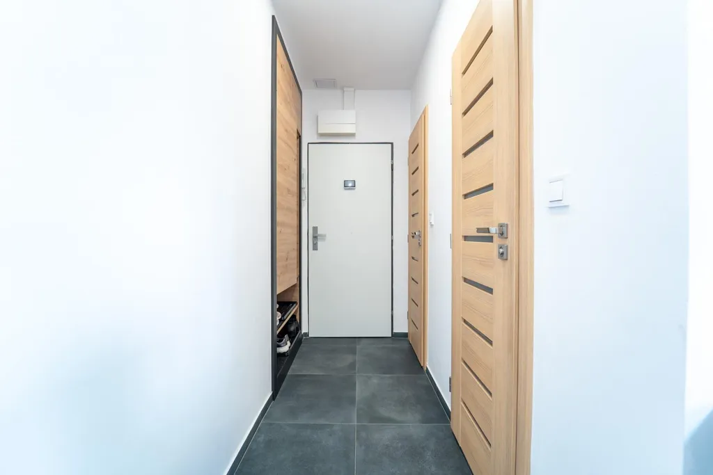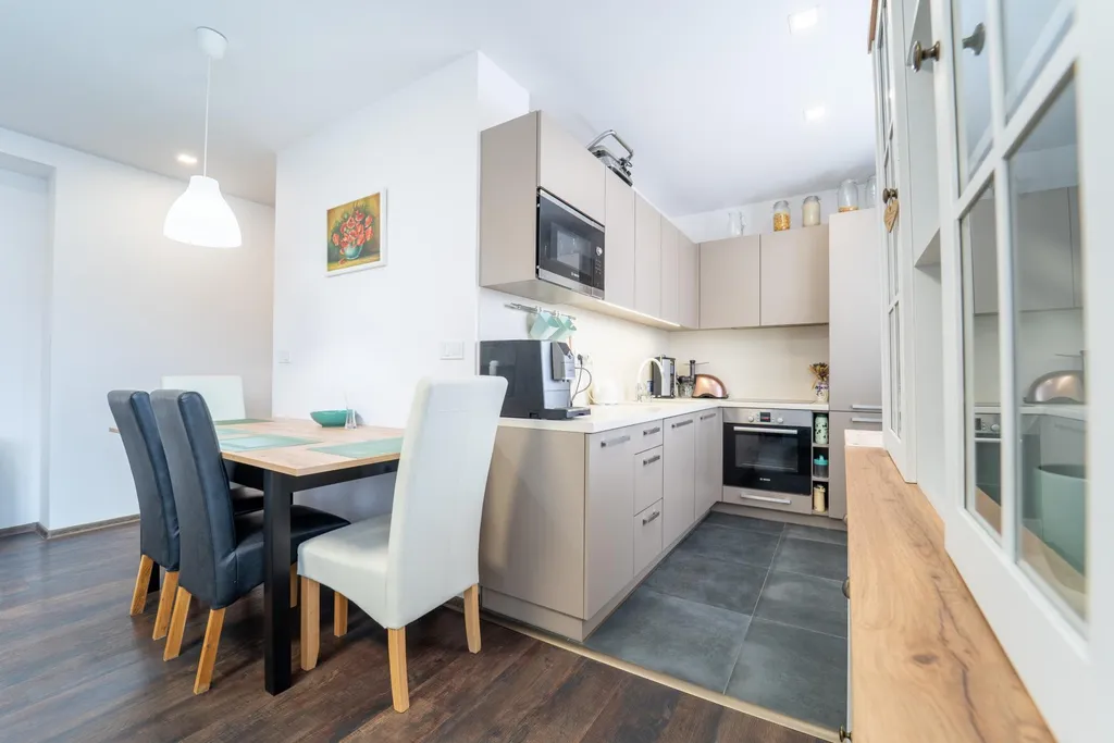 Dominantou bytu je moderní kuchyňská linka vyrobená na míru, vybavená kvalitními a moderními spotřebiči. Koupelna disponuje sprchovým koutem, koupelnovou skříňkou se zrcadlem a praktickým prostorem pro pračku i sušičku. Toaleta je samostatná.