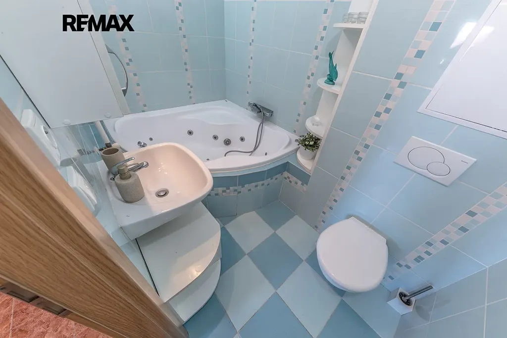 Koupelna s masážní vanou působí svěže a moderně a nabízí ideální prostor pro relax po náročném dni. Samozřejmostí je sklepní kóje pro praktické uskladnění věcí a k dispozici je také společná kočárkárna. V domě je zavedené rychlé optické připojení k internetu.