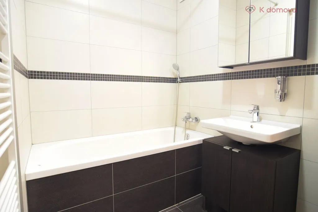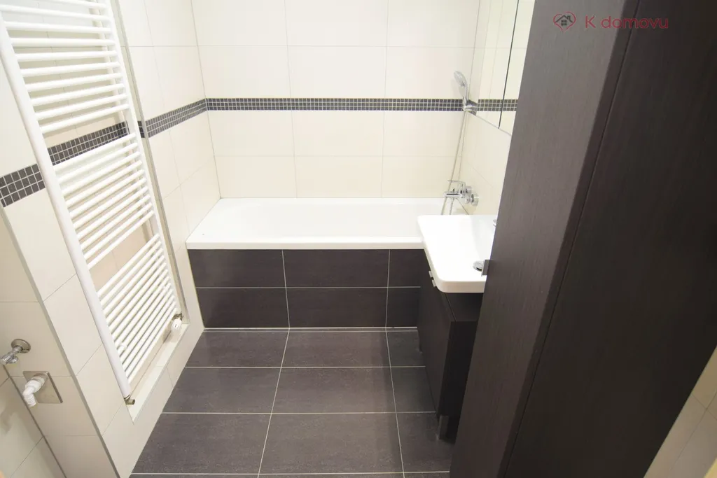 • Koupelna (4 m2) vybavená vanou, umyvadlem se skříňkou, samostatnou koupelnovou skříňkou, topným žebříkem, přípojkou na pračku.