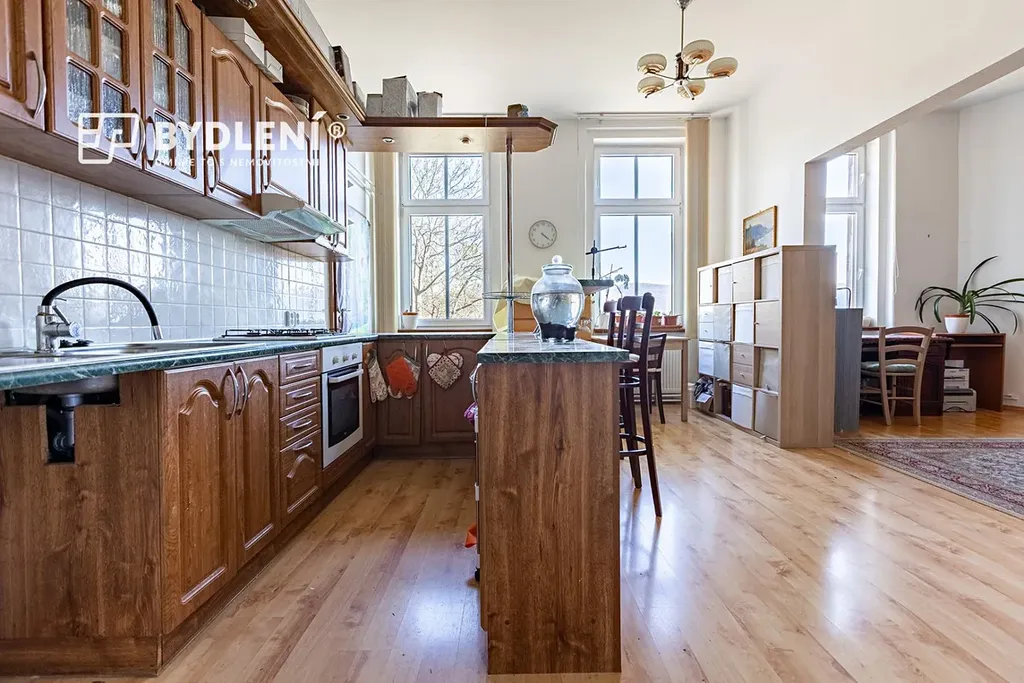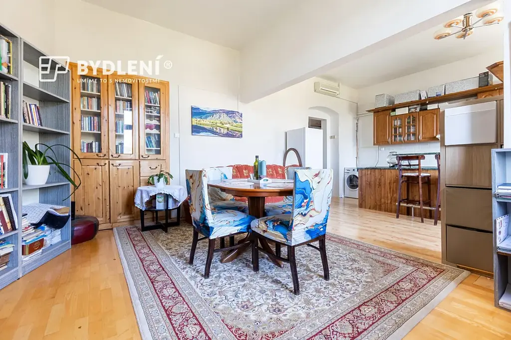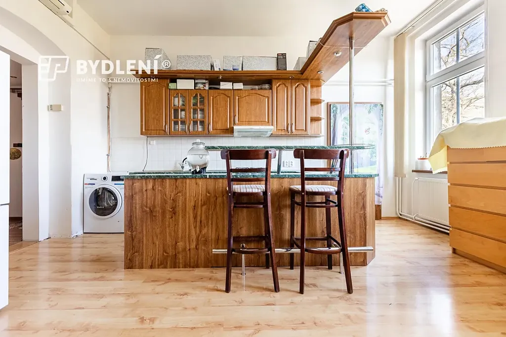 Současné uspořádání bytu však odpovídá spíše dispozici 3kk, kuchyň je totiž z velké části propojena s obytným prostorem, což vytváří vzdušný a otevřený celek odpovídající dnešním nárokům na bydlení. Přidanou hodnotou je výhled do zeleně v protějším parku.