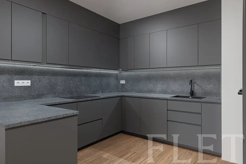 Dominantou bytu je prostorný obývací pokoj s moderním kuchyňským koutem, který nabízí opravdu velkorysou pracovní i úložnou plochu – ideální pro každého, kdo rád vaří nebo tráví čas s rodinou. Kuchyně je vybavena všemi vestavnými spotřebiči včetně indukční desky, trouby, mikrovlnné trouby, myčky i lednice s mrazákem. Dispozice dále zahrnuje dvě samostatné ložnice, přičemž nechybí dostatek úložných prostor – vestavěná skříň v předsíni, velká šatní skříň v ložnici a samostatná místnost vhodná jako šatna či komora. Koupelna a toaleta jsou oddělené, což přispívá k vyššímu komfortu bydlení.