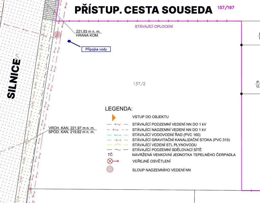 Na pozemku je zřízena přípojka obecní vody. Elektřina, CETIN a kanalizace jsou vedeny přímo na hranici pozemku u přilehlé komunikace (viz situační výkres). Plyn je veden na druhé straně silnice.