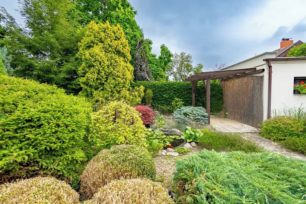 U domu se rozkládá nádherná, pečlivě udržovaná zahrada se zakrytým posezením u rybníčku, kde plavou barevné rybky, přinášející klid a harmonii. Okrasné stromy, keře a květiny dotvářejí malebný ráj, který zve k odpočinku a chvílím pohody.