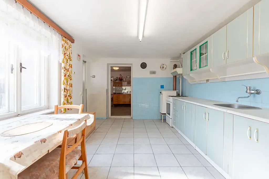 Do domu vstoupíte přes průjezd o výměře 26 m², který může sloužit také jako garáž pro menší osobní automobil. Z průjezdu je vstup na dvorek nebo do chodby, která propojuje verandu a kuchyni o výměře 16,5 m². Z kuchyně se dále vstupuje do tří pokojů, které jsou aktuálně průchozí. Součástí dispozice je také spíž a koupelna s toaletou. Z verandy je přístup do kotelny a dílny.